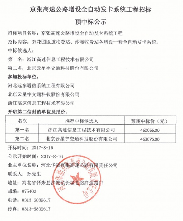 京張高速公路增設全自動發(fā)卡系統(tǒng)工程招標預中標公示