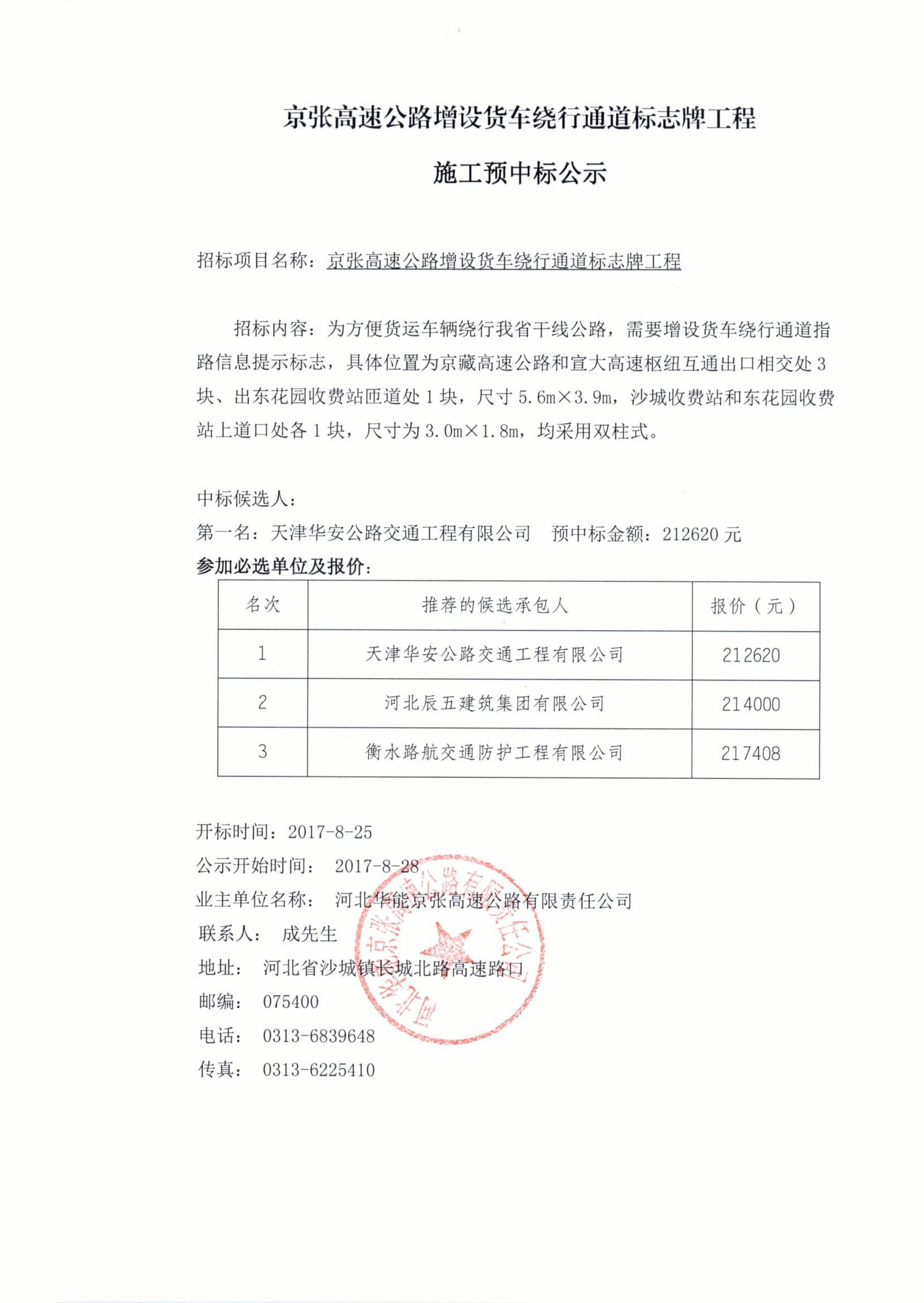 京張高速公路增設(shè)貨車繞行通道標志牌工程施工預中標公示