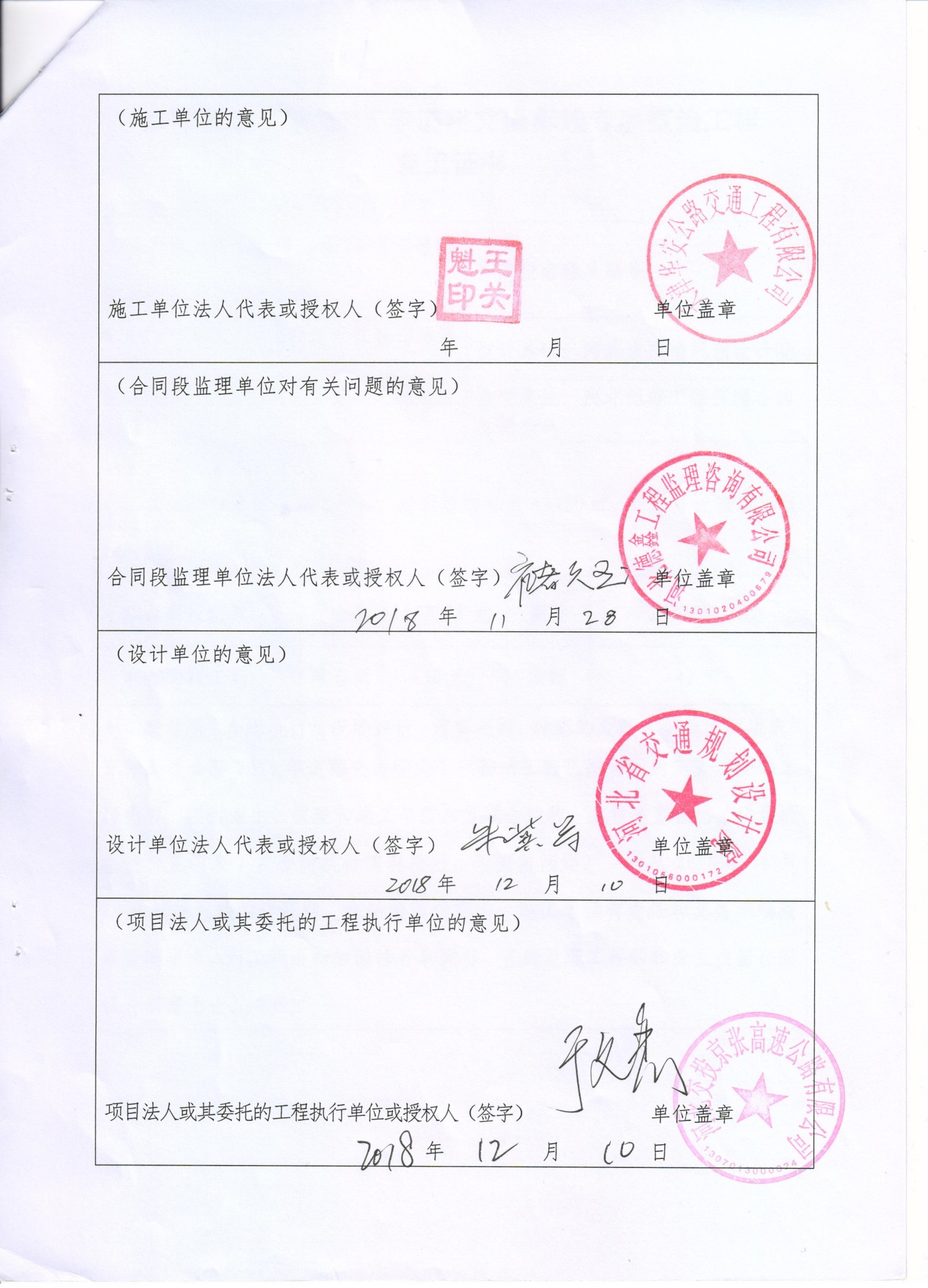 京張高速公路2018年道路交通標線專項整治工程交工證書